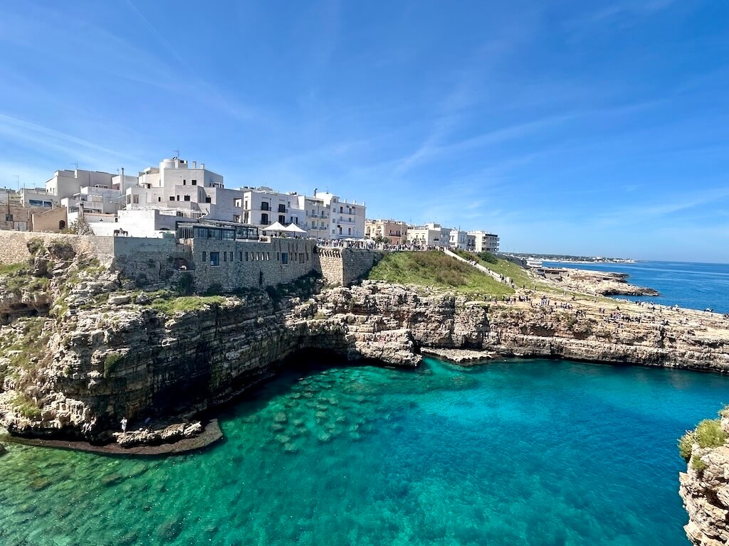 Autre escapade depuis Monopoli : Polignano a Mare. Sa plage iconique coincée entre les falaises est spectaculaire, même si très fréquentée en haute saison.