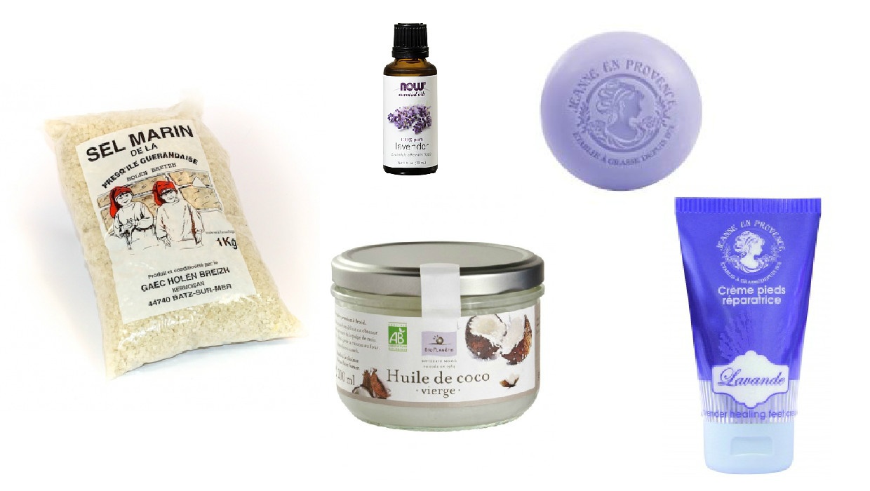 Côte shopping : gros sel, huile de coco et huiles essentielles font parties des basiques que j’ai en permanence dans mes placards, vous en trouverez facilement en grande surface ou magasin Bio. Pour les soins manufacturés, en ce moment j’utilise la gamme Lavande de Jeanne en Provence, la crème pieds réparatrice est divine ! ( 4€ les 75ml en GMS ou sur l’eshop de la marque )