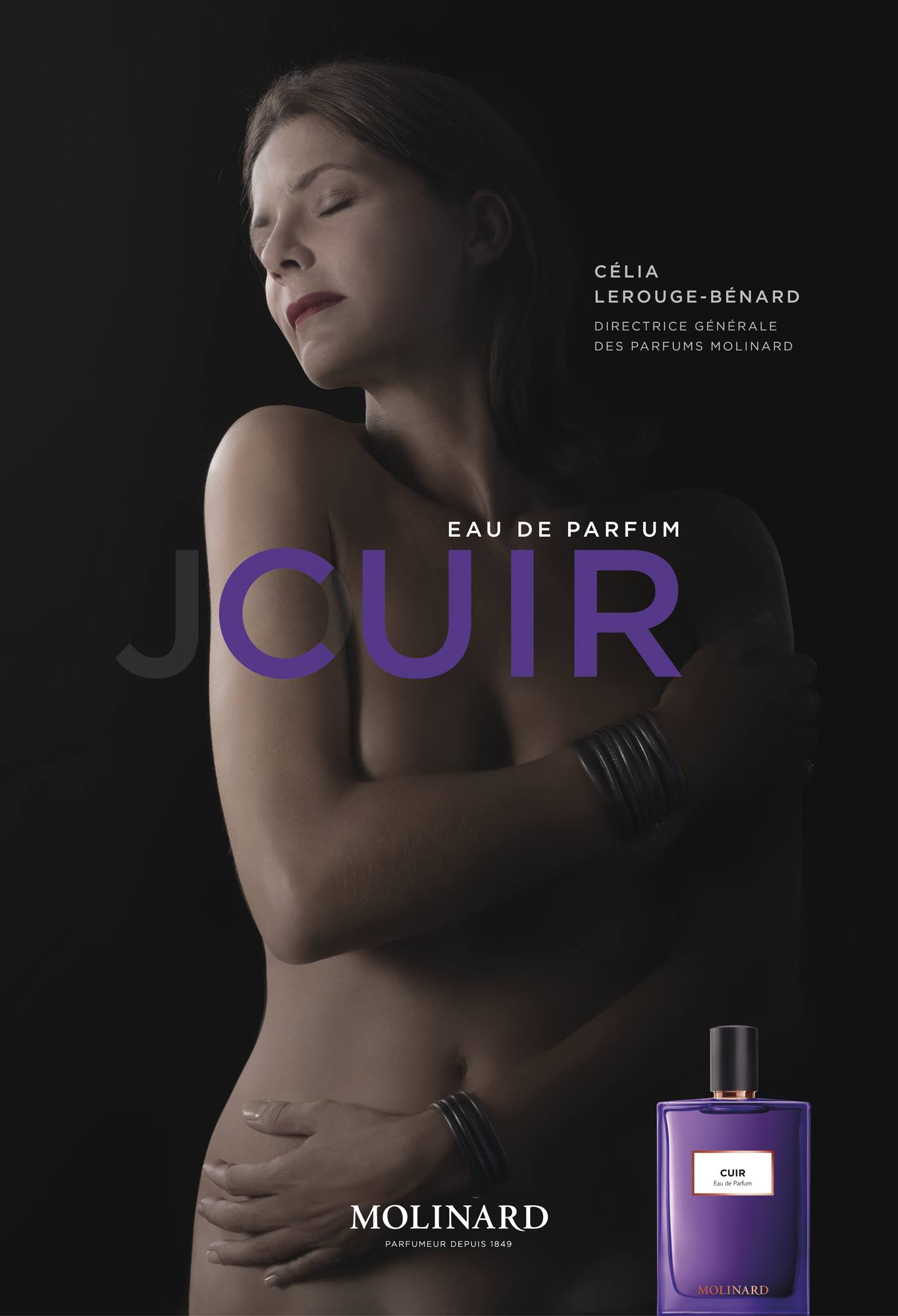 Cuir est surprenant, détonnant même, voire provocant, tout comme la campagne publicitaire qui l’illustre, en effet c’est Célia Lerouge-Bénard, directrice générale des parfums Molinard, qui s’est mise à nue sur les visuels ! On notera également l’association des mots cuir et jouir, tout un programme…