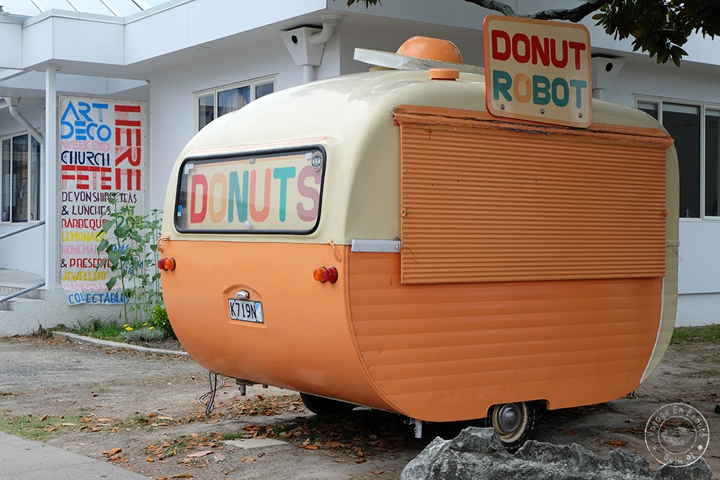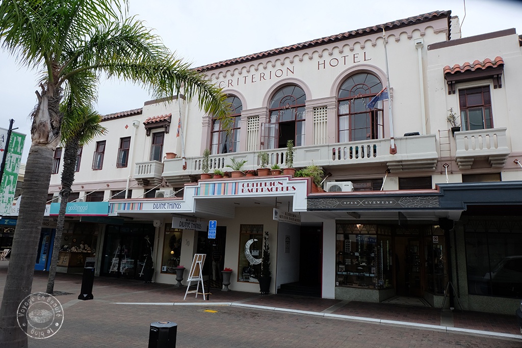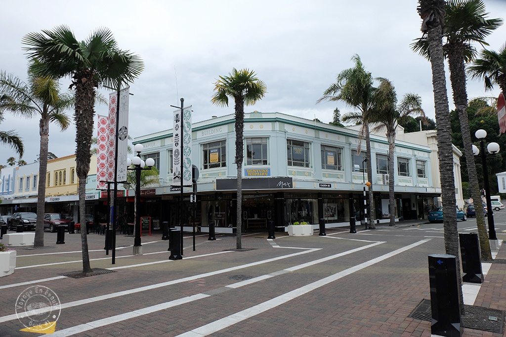 Détruite dans les années 1930 par un tremblement de terre, la ville de Napier a été entièrement reconstruite dans le style architectural en vogue à ce moment là : l’ART DECO ! Façades colorées, lignes géométriques, rues linéaires bordées de palmiers, la foule et le bling-bling en moins on pourrait presque se croire à Miami Beach…