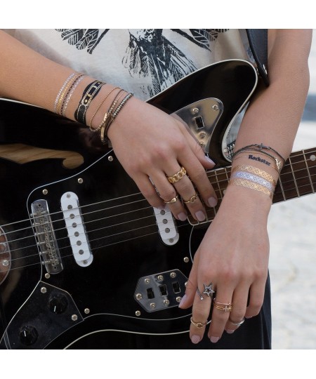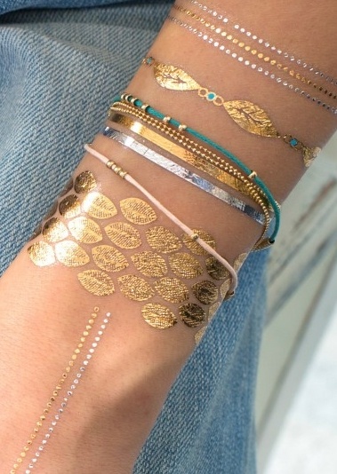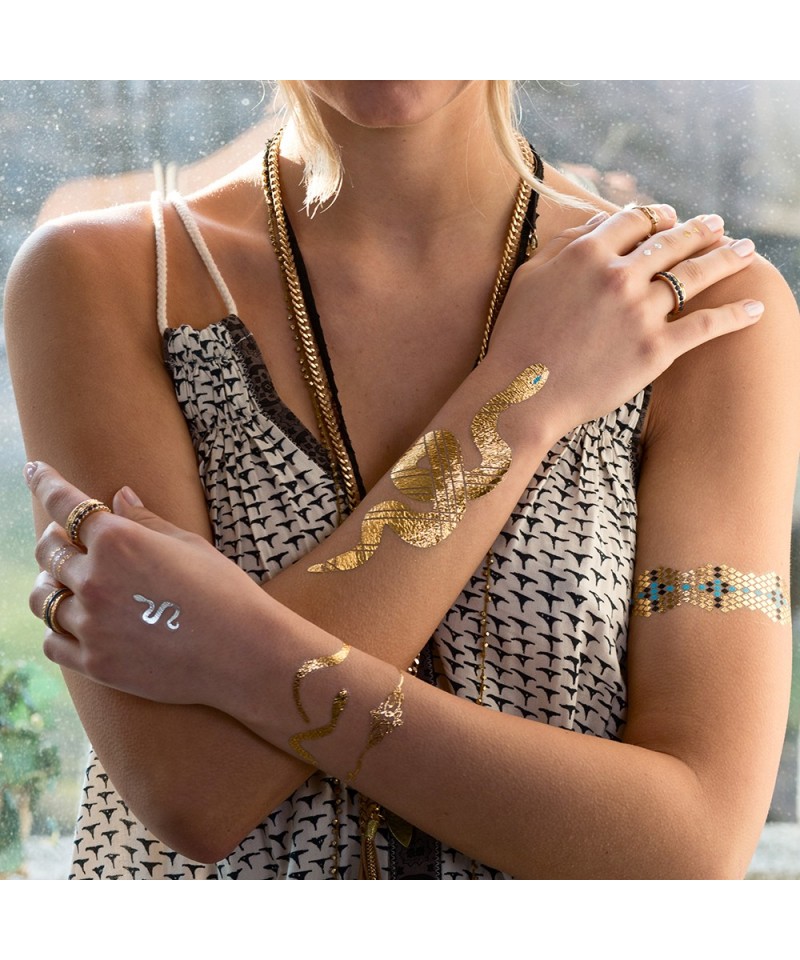 L’illusion est parfaite, les bijoux éphémères se mêlent harmonieusement à nos vrais bijoux et si on fait attention à ne pas trop frotter sous la douche ou en appliquant la crème solaire, leur tenue peut aller jusqu’à 6 jours.