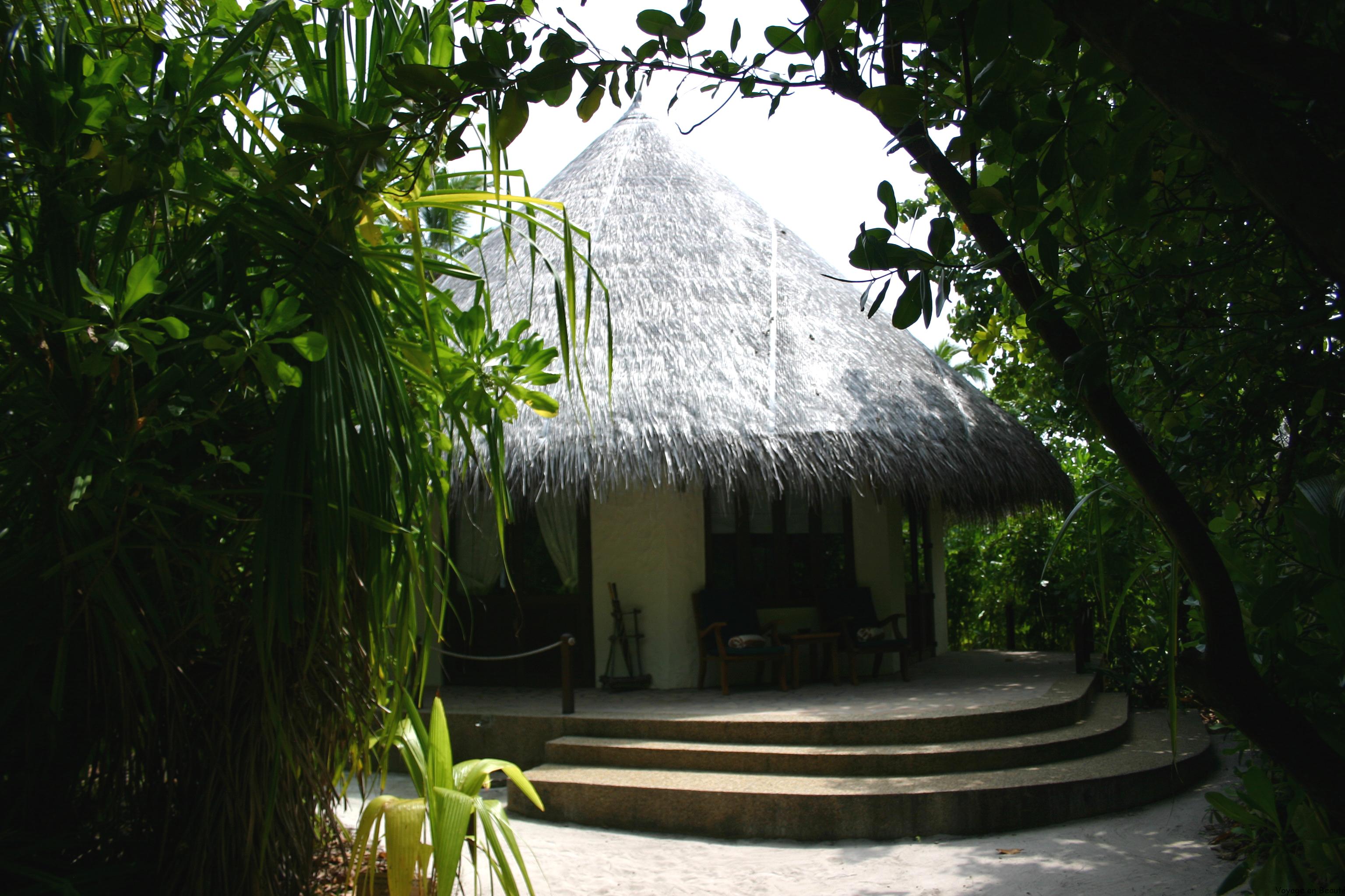 Notre « beach villa » (un petit nid de 87 m2 (!) niché dans la végétation avec accès direct à la plage) nous attend : pétales de fleurs, bouteille de Champagne, coupe de fruits frais, rien de tel pour bien commencer la journée et se remettre d’un long voyage ! Dès notre arrivée nous comprenons tout le sens de la devise du Coco Palm : « no news, no shoes » , en effet pas de télévision, téléphone ou wifi dans les « villas », ici on déconnecte !