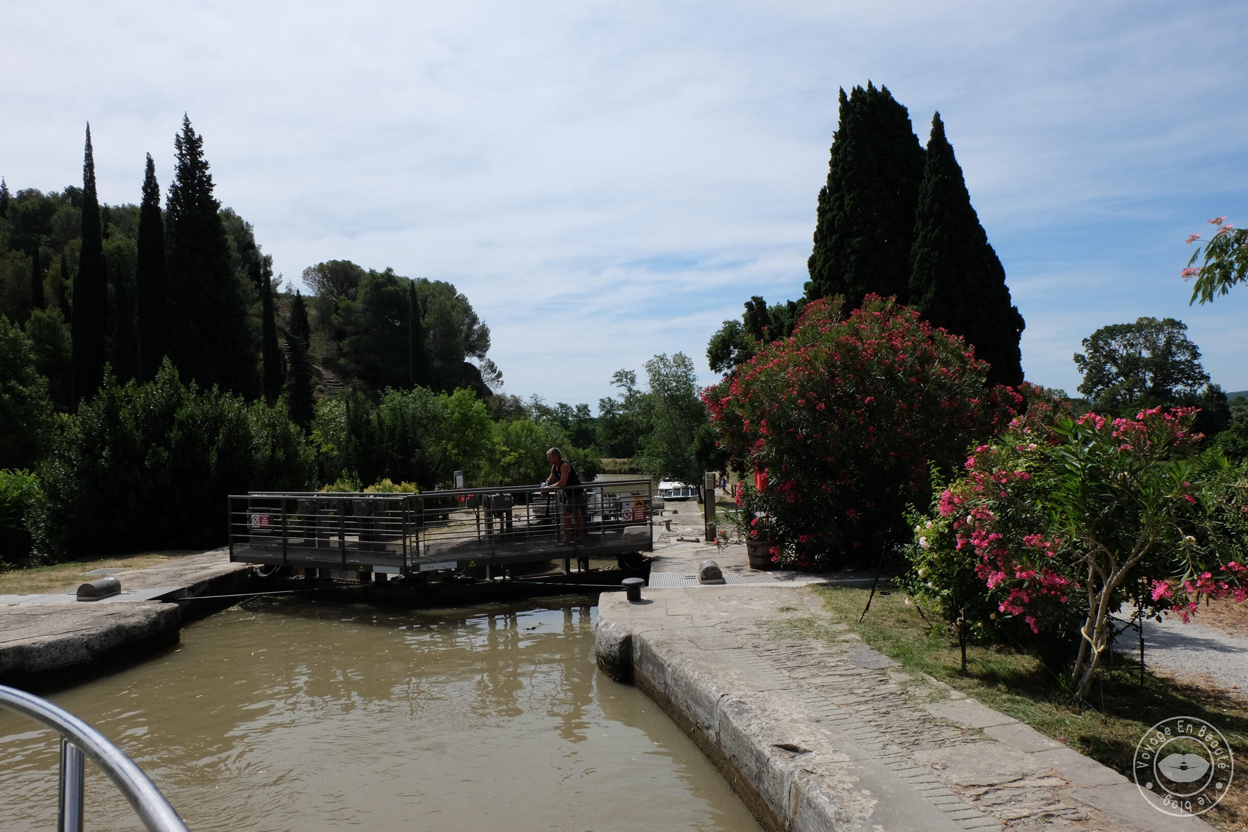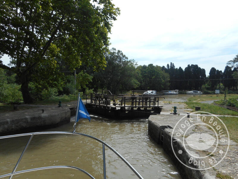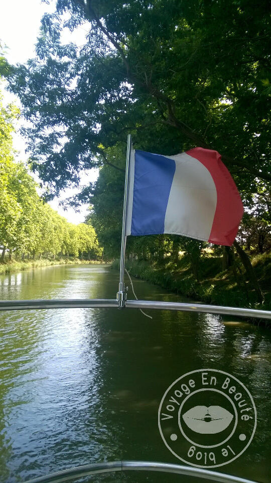 Après avoir investi le bateau avec nos valises et les provisions pour 4 jours, Mathieu des canalous nous a enseigné les rudiments de pilotage de notre péniche sans permis, il nous a montré comment effectuer quelques manœuvres pour accoster ou passer les écluses et en milieu d’après midi nous voguions en totale autonomie sur le Canal du Midi !