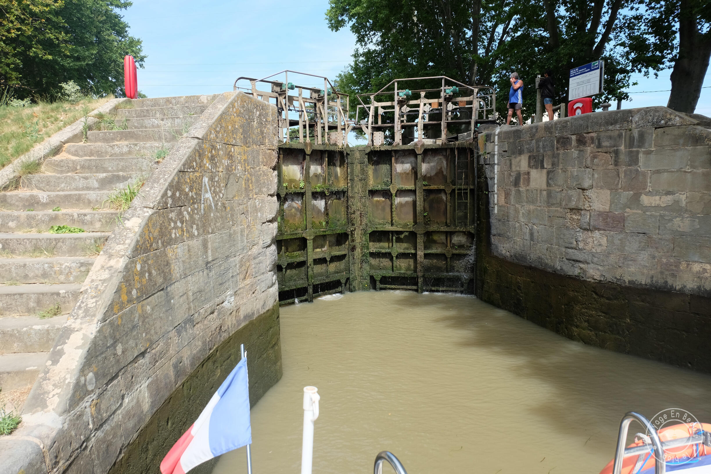 C’est avec un peu appréhension qu’en début d’après-midi nous avons franchi nos premières écluses, là encore la manœuvre n’est pas bien compliquée, mais elle nécessite néanmoins quelques explications et un peu d’agilité ! Fort heureusement sur cette partie du parcours les éclusiers sont là pour vous conseiller et vous donner un coup de main.