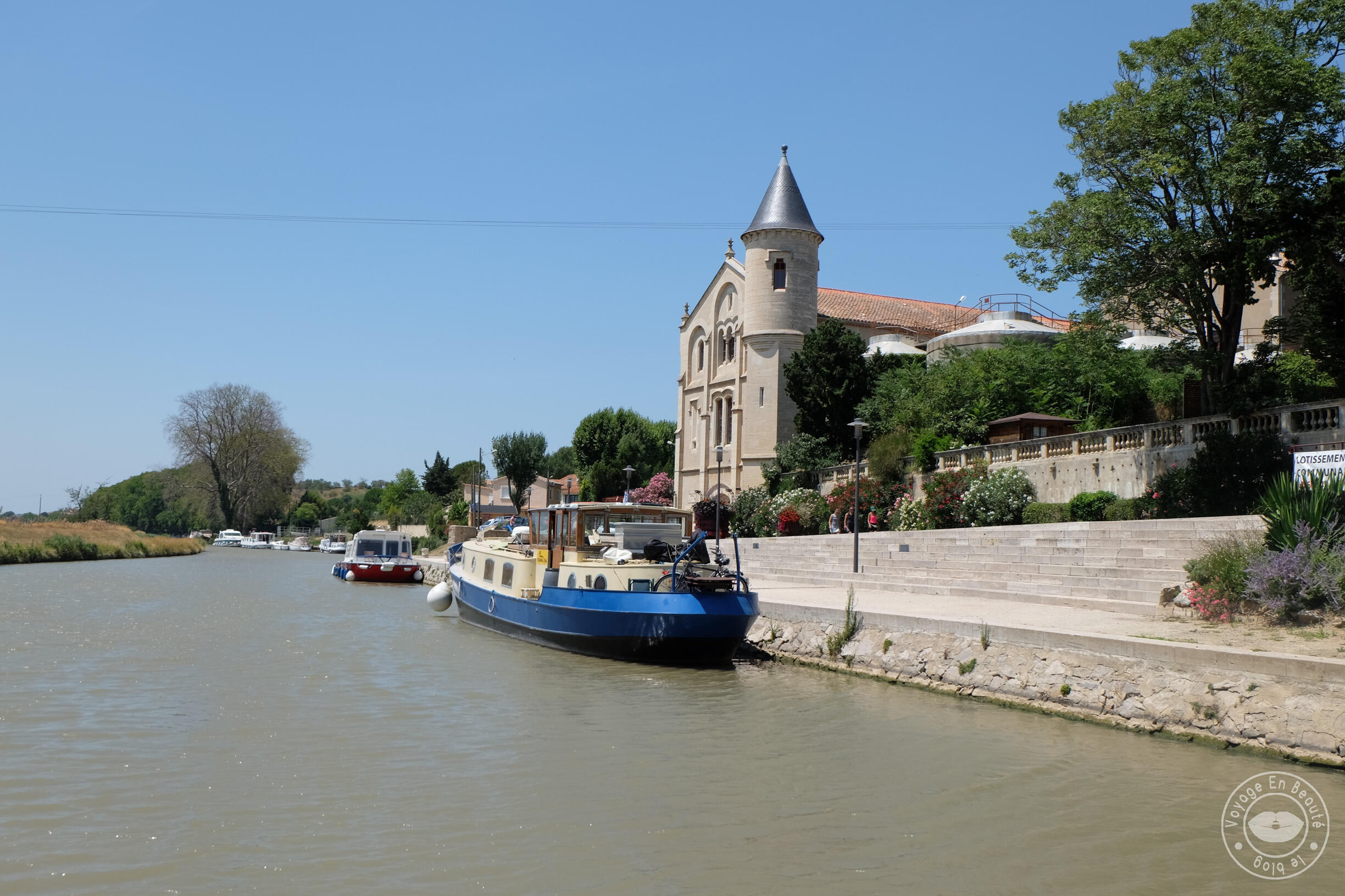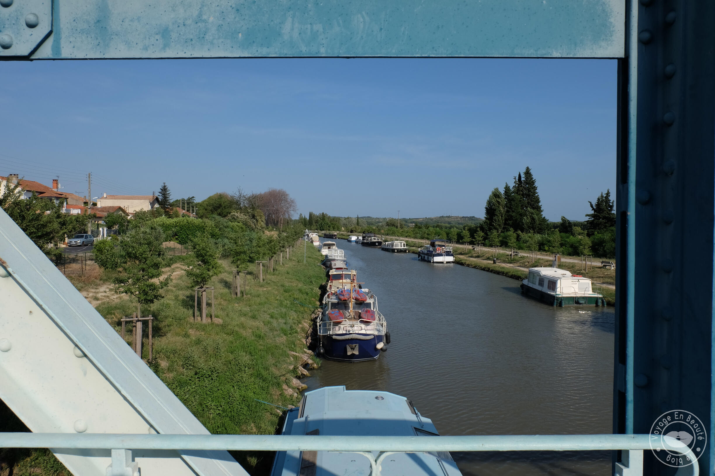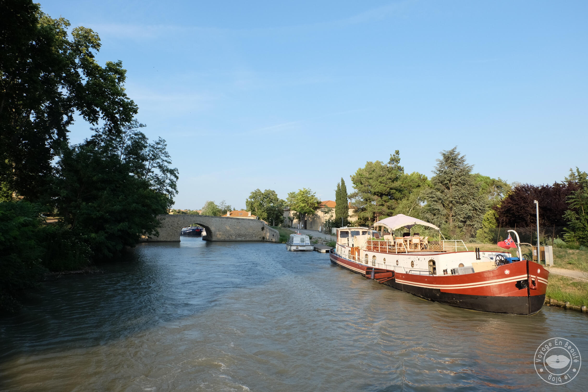 Nous avons ensuite repris notre route à la recherche d’un endroit sympa pour dormir : nous ne voulions pas dormir dans un port mais nous ne voulions pas non plus être seuls au milieu de nulle part ! La navigation étant interdite après le coucher du soleil, nous sommes arrêtés entre Capestang et Argeliers, à 3h de notre point de départ, un gentil anglais amarré là avec sa péniche trois fois plus grosse que la notre nous a aidé à accoster et nous avons passé notre première nuit sur l’eau !