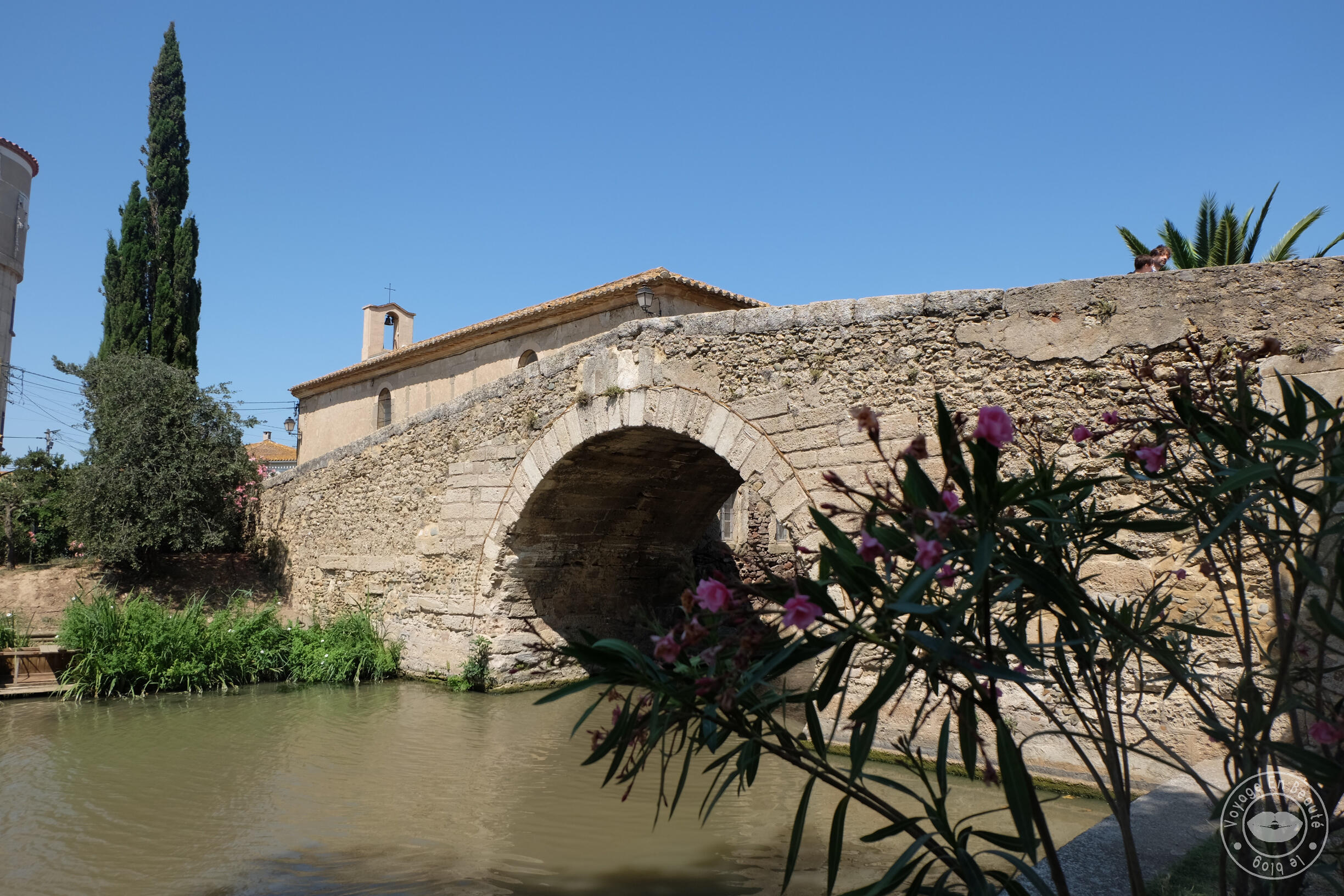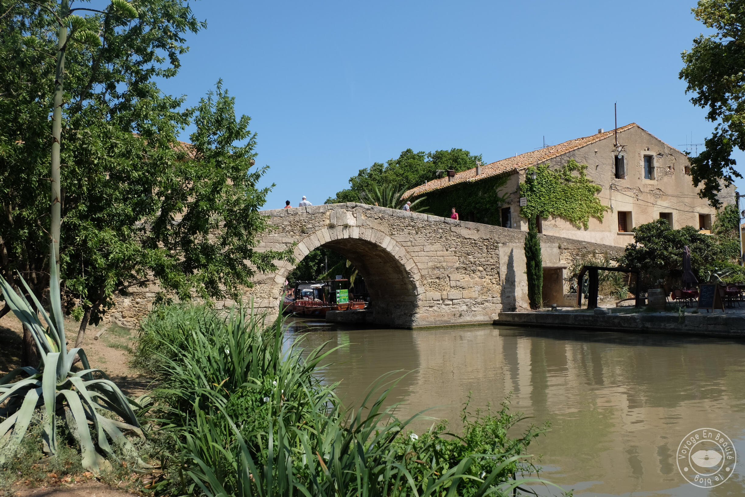 Après quelques heures de navigation nous avons fait une première halte dans le village de Capestang, notre premier amarrage du bateau en pleine nature a été un peu sport, il faut qu’un d’entre nous saute sur le chemin de halage, qu’un autre resté sur la bateau lui envoie les amarres (les cordages) et les piquets, et que celui qui est à la barre maintienne le bateau pendant toute la durée de la manœuvre ! Entre la canicule et nos exercices de parfaits mariniers , on était en nage et le panaché bu à l’ombre des platanes sur la place du village a été plus qu’apprécié !