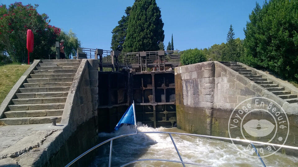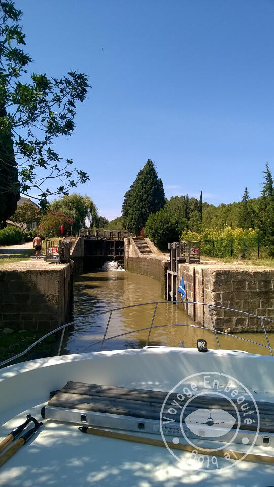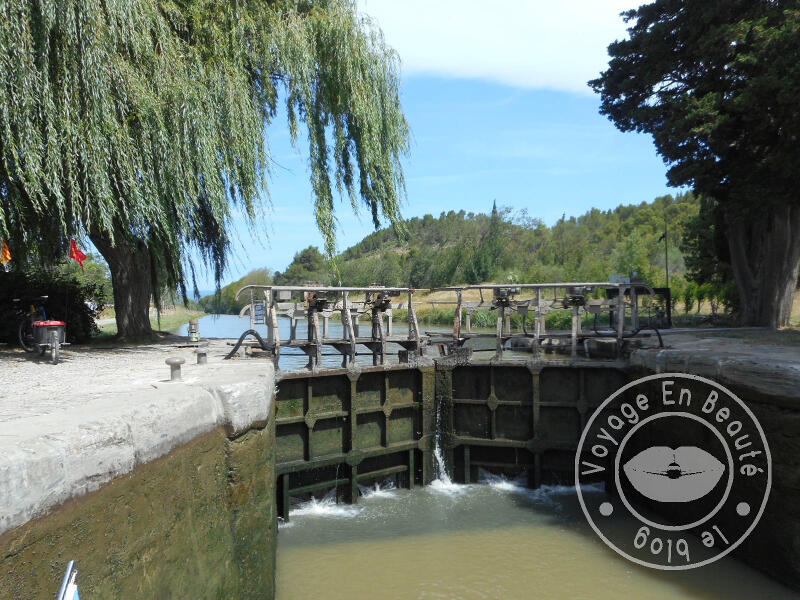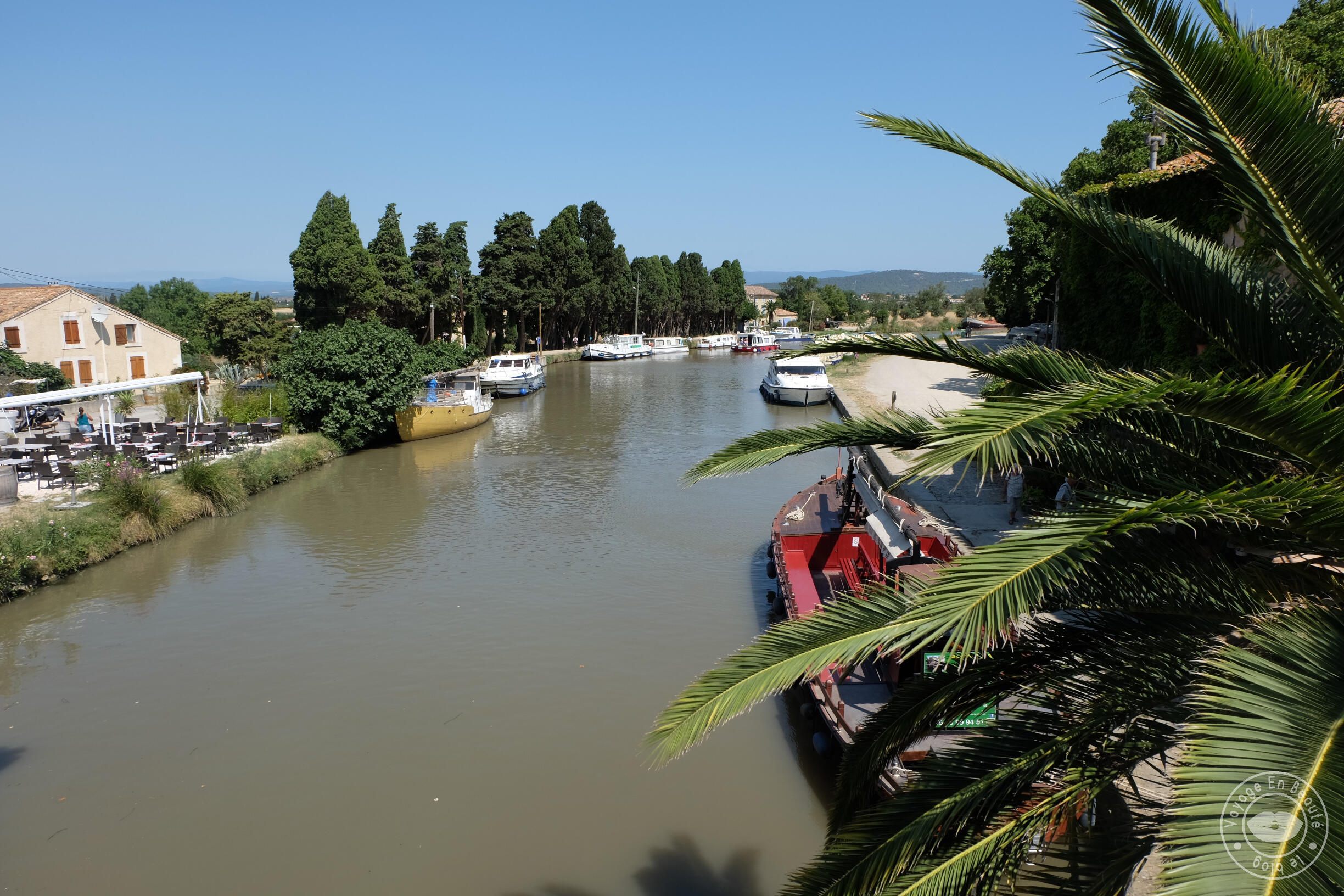 Après 6 écluses et une journée de navigation en plein soleil et en plein vent, nous arrivons à Homps dans l’Aude, comme c’est une base canalous nous pouvons en profiter pour recharger gratuitement nos batteries, remplir notre réserve d’eau et surtout passer un looooooong moment sous la douche fraiche : quel bonheur !