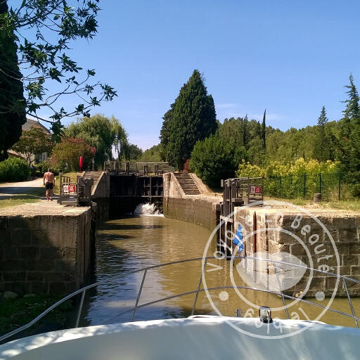 Le lundi nous avons décidé de faire demi-tour pour revenir tranquillement vers notre point de départ où nous étions attendus pour le 14 juillet. Comme les jours précédents nous avons profité des ces moments de quiétude au fil de l’eau, nous avons fait escale à Ventenac le château pour découvrir les crus des vignobles du minervois, nous avons passé la nuit à Capestang puis comme prévu le 14 après 108 kilomètres et 12 écluses nous sommes rentrés à bon port…