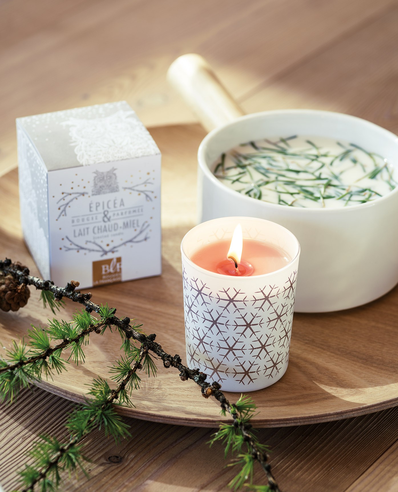 On oublie les conventionnelles odeurs cannelle-orange, pain d’épices ou vanille pour se plonger avec délectation dans une tasse de lait chaud infusé aux aiguilles d’épicéa avec la bougie Epicéa et lait chaud. C’est doux et piquant à la fois, apaisant, sensuel, parfait pour une soirée cocooning en amoureux !