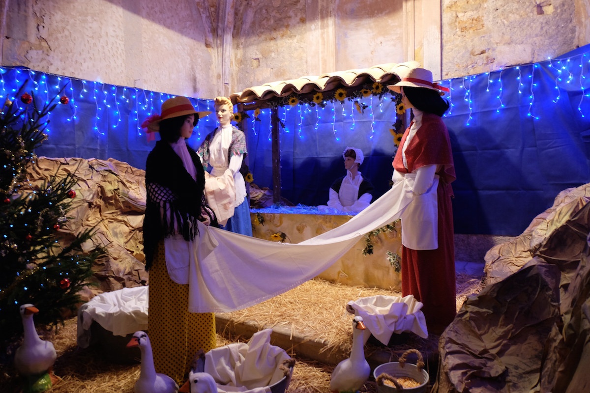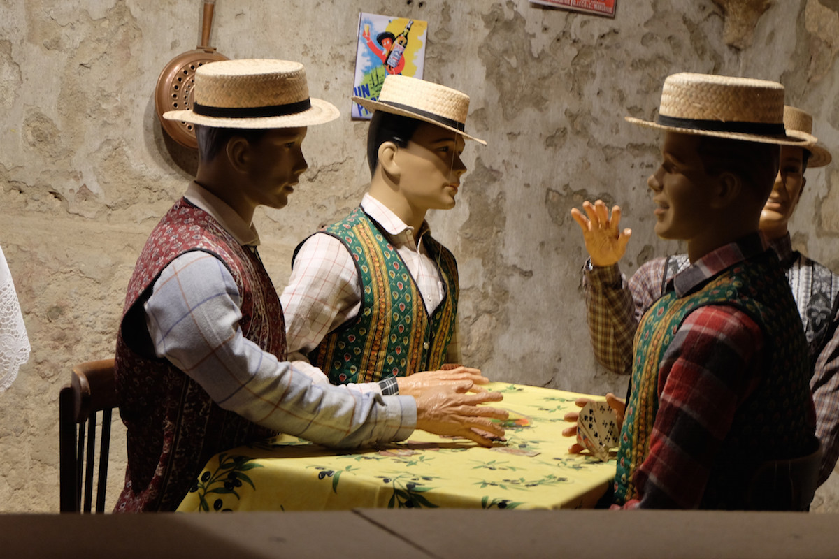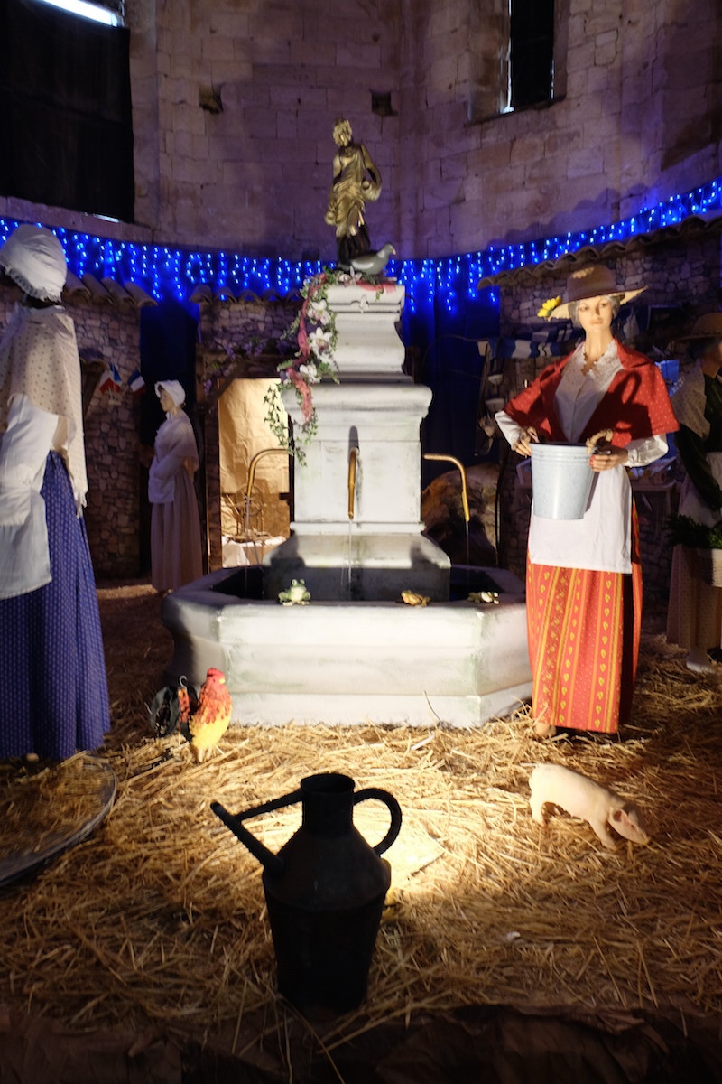 Dans l’ancienne chapelle en pierre, ce sont les santons provençaux et les personnages traditionnels qui sont à l’honneur et sont représentés en taille réelle, il parait même que c’est la plus grande crèche de France. On retrouve bien sûr les scènes de la nativité mais aussi les traditions provençales, avec la partie de cartes de Pagnol, les lavandières, ou encore le meunier.
