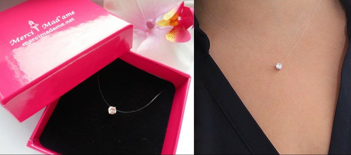 Je me suis fait également un petit plaisir supplémentaire avec le collier Monaco, c’est un petit diamant monté sur un fil de nylon invisible, en fait j’avais le même il y a quelques années et on me l’a dérobé lors d’un cambriolage, alors quand j’ai vu qu’il existait son jumeau version oxyde de zirconium à 18€ je n’ai pas hésité une seconde ! Et très honnêtement à moins d’être un expert en joaillerie, le rendu est plus que réaliste.