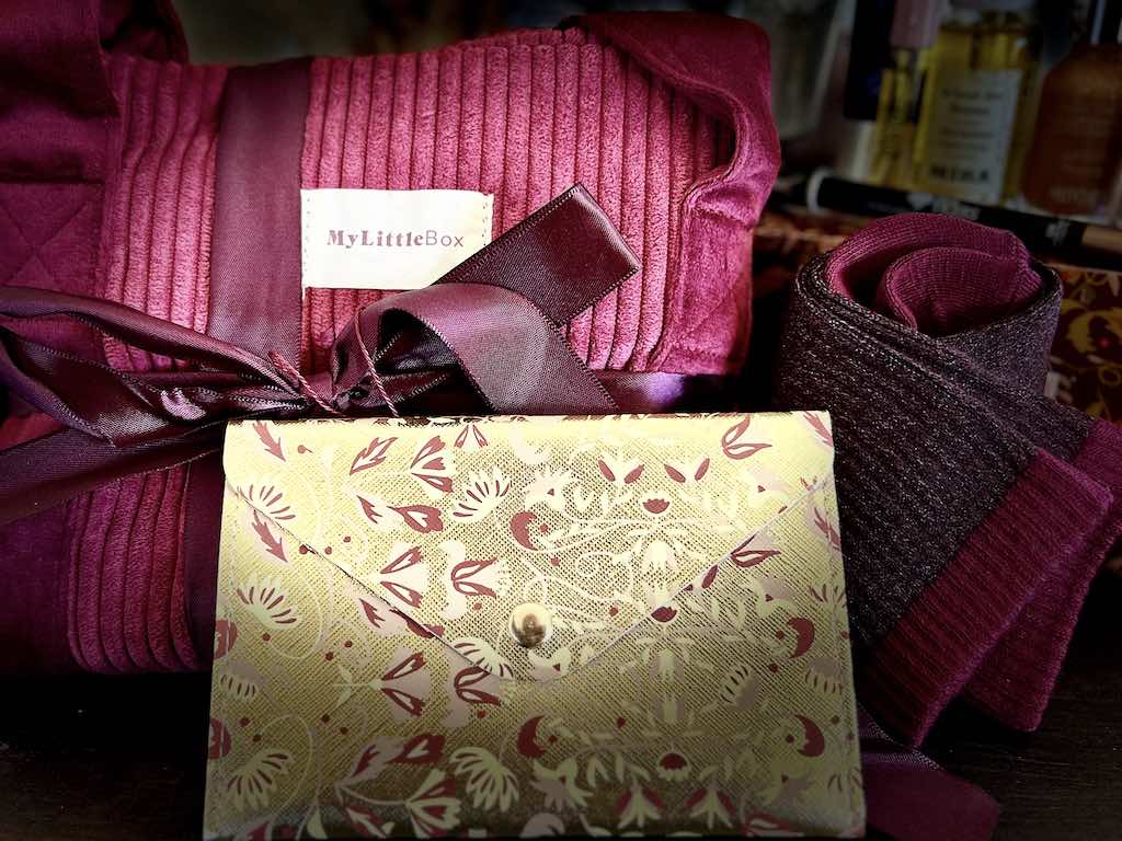 My Little Box a glissé l’ensemble des surprises du mois dans un très grand sac en velours ras bordeaux et un crackers réutilisable. Doté d’un fermeture éclair ce sac sera le compagnon de voyage idéal pour une courte escapade, son format est en effet parfaitement adapté aux dimensions cabines exigées par les compagnies aériennes low cost ;-) On pourra également le coordonner à la jolie pochette imprimée dorée ainsi que la paire de chaussettes pailletées, bordeaux évidemment !