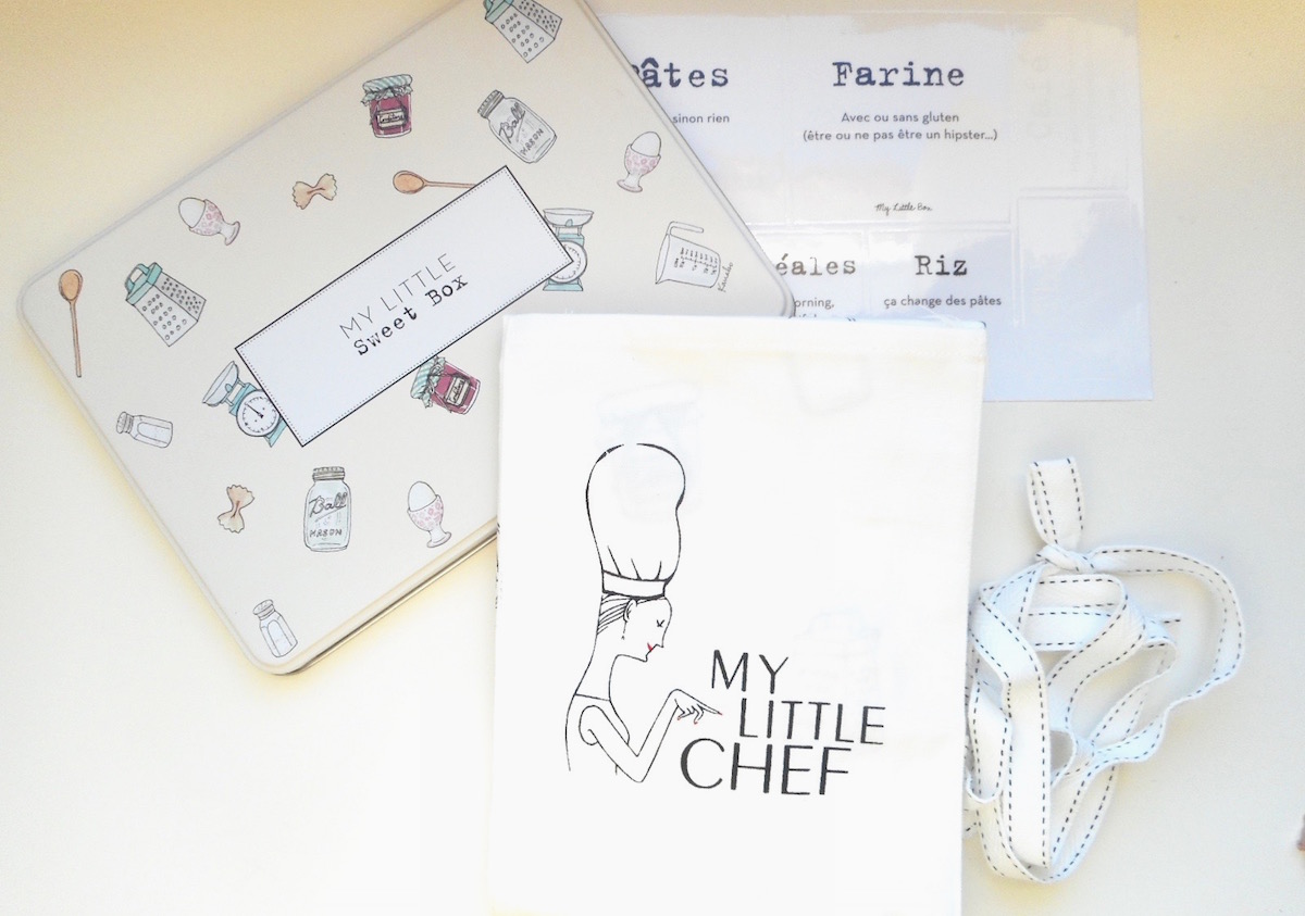 Côté goodies enfin, on peut d’ailleurs considérer que la boite en elle même est un cadeau, on découvre un mignon tablier de cuisine My little chef qui tombe à pic puisque j’en cherchais un pour little M. qui l’a d’ors et déjà adopté, ainsi qu’une série d’étiquettes pour bocaux très chouettes.