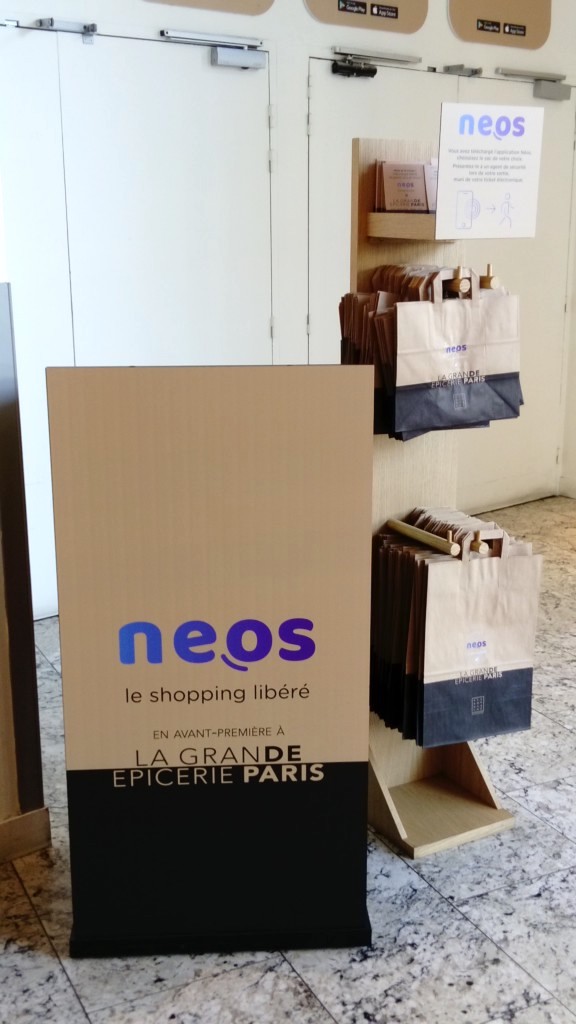On retrouve l’application « NEOS » dans l’app store ou google play. Il suffit de créer un compte et de rattacher une ou plusieurs cartes bleues. Actuellement le service est disponible à la Grande Epicerie de Paris 38 rue de Sèvres dans le 7ème arrondissement de Paris.