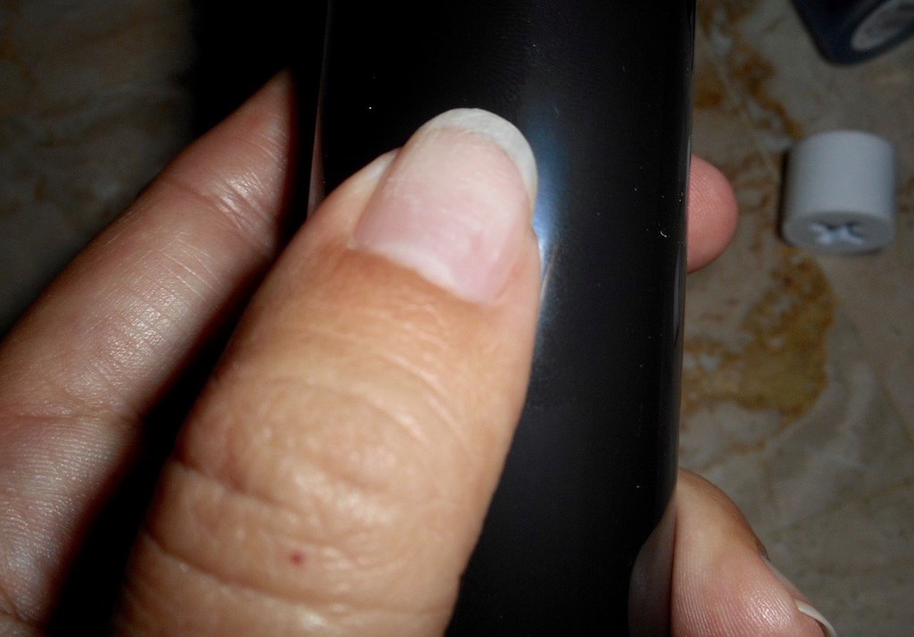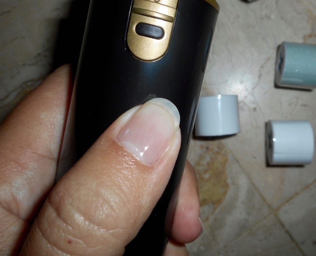 Après avoir massé puis repoussé mes cuticules comme je le fais généralement avant une manucure classique, il suffit de mettre l’appareil en route et de le passer quelques secondes sur l’ongle pour dans un premier temps le poncer grâce à la brosse verte légèrement abrasive qui gomme comme par enchantements stries et petits défauts.