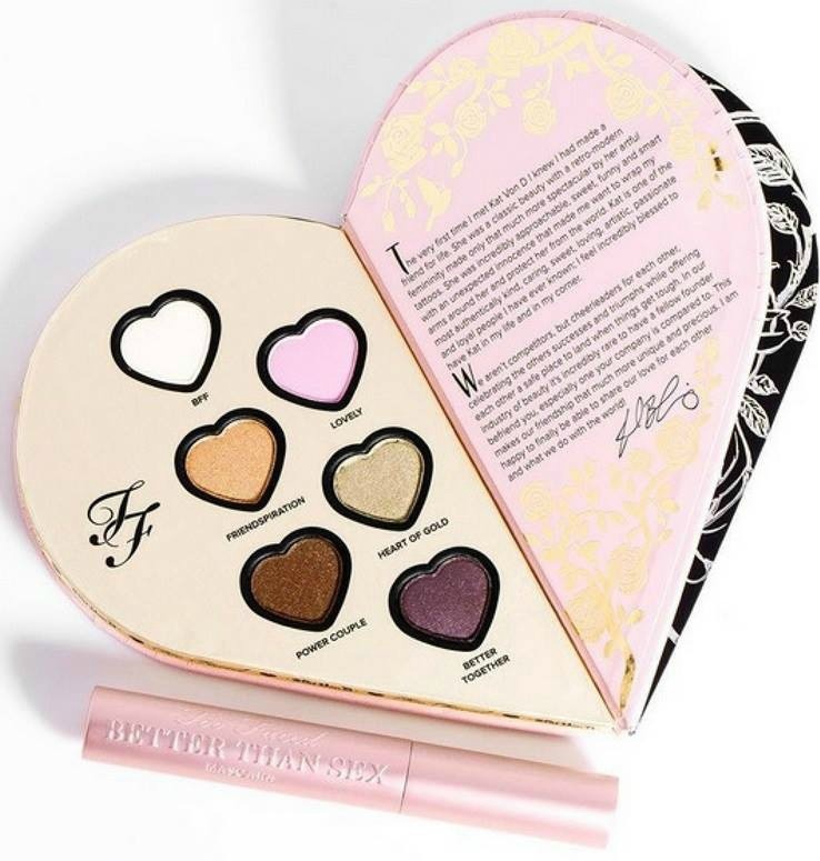Depuis quelques jours la toile s’enflamme, ce qui n’était qu’une rumeur est désormais officiel : Too Faced et Kat Von D s’associent pour nous offrir une sublime palette en édition ultra limitée ! Présentée sous la forme d’un livre cœur bicolore, elle porte le joli nom de Better Together , scellant ainsi l’amitié qui unit Jerrod Blandino et Kate Von D. les deux make up artist.