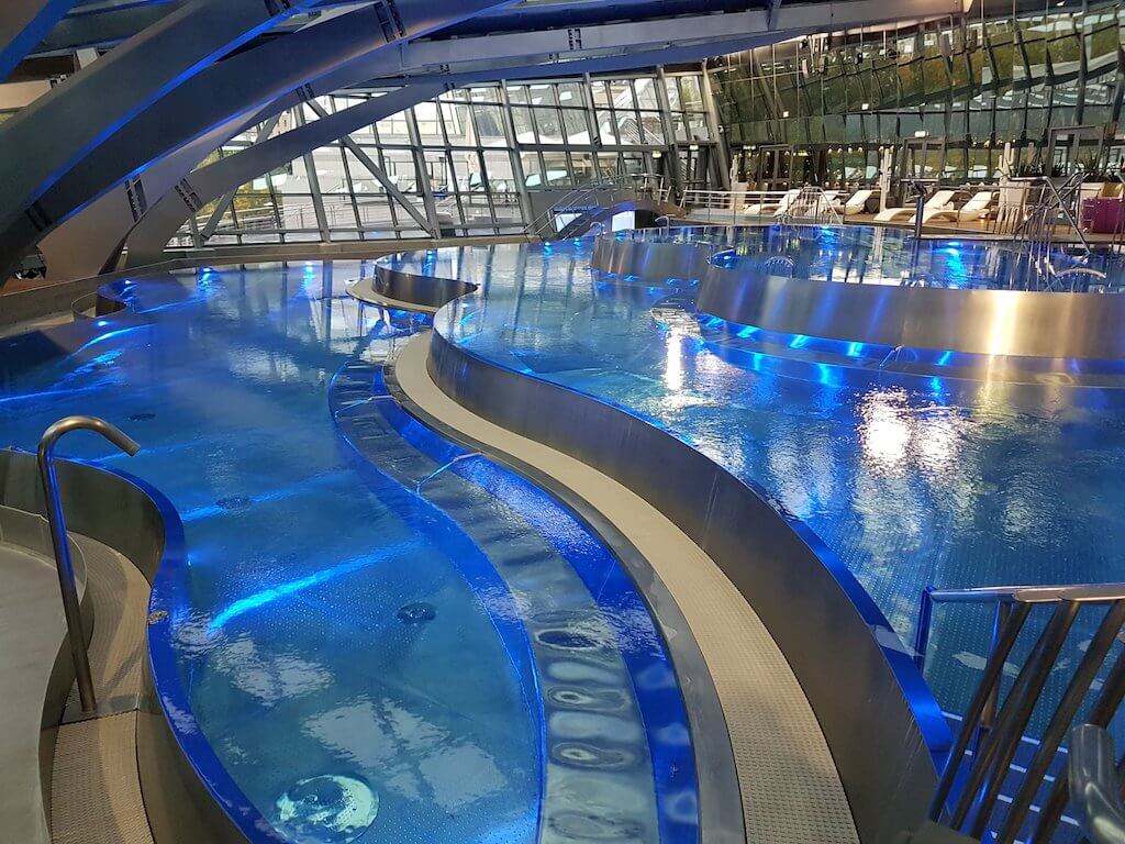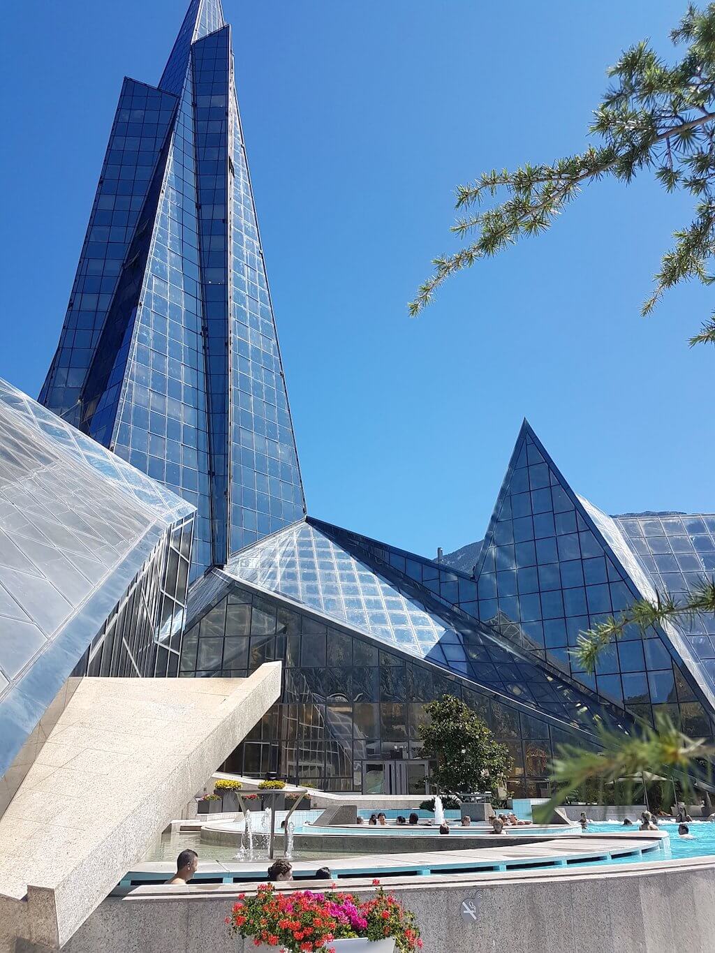 Dans un bâtiment futuriste évoquant les cimes enneigées, on retrouve des piscines, des jacuzzis, des saunas, des hammams, tous alimentés par les eaux thermales andorranes qui jaillissent à près de 70º et sont riches en souffre et minéraux.