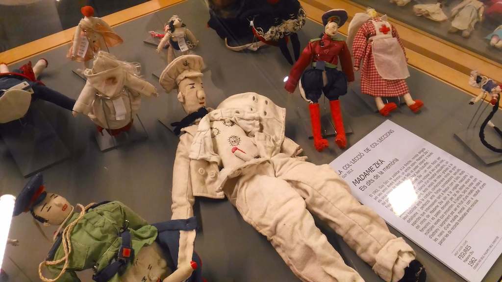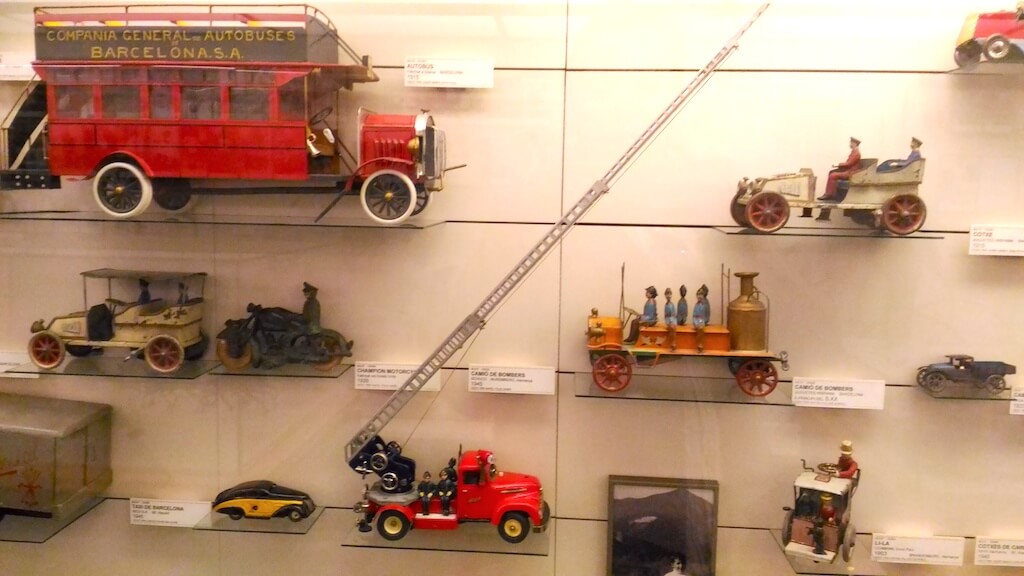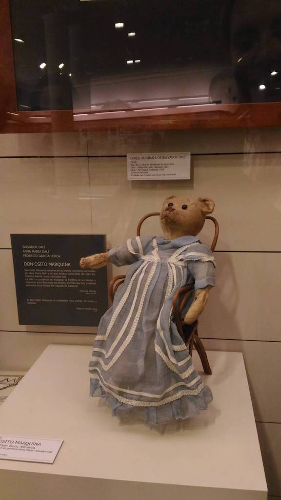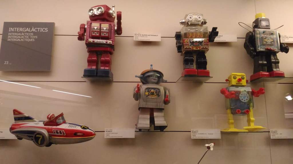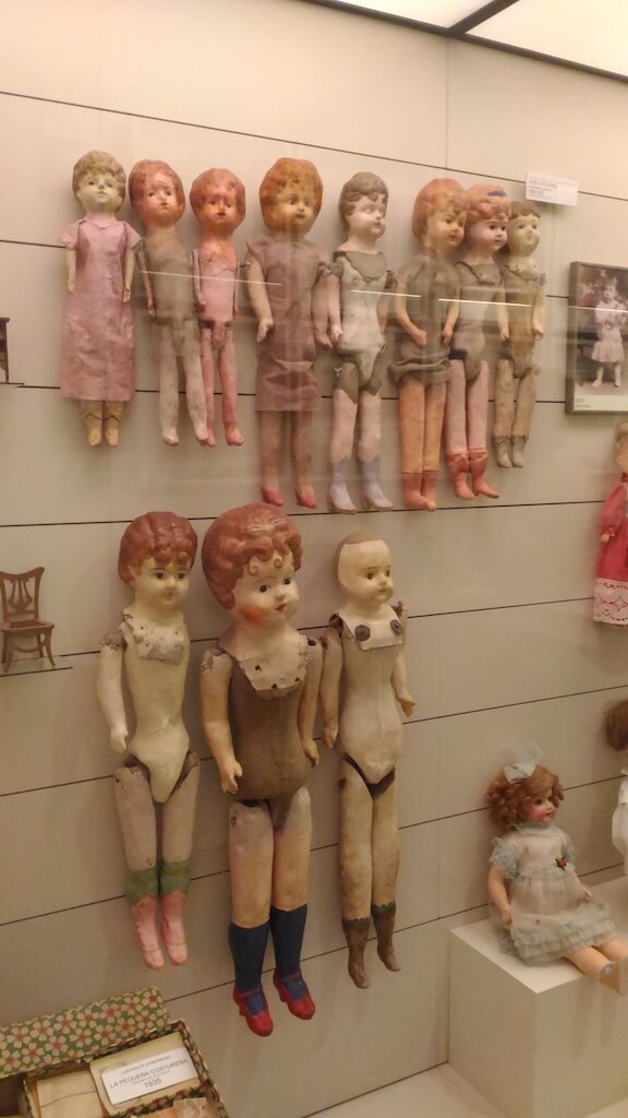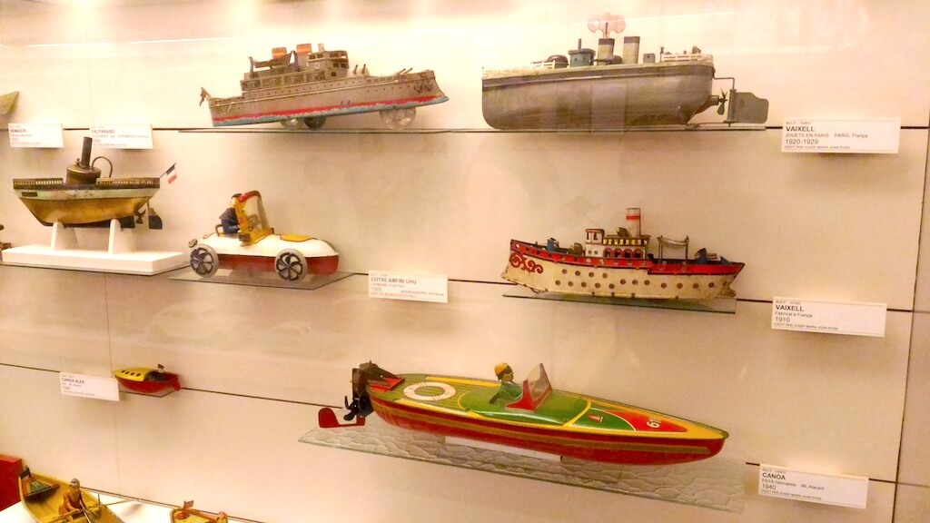 Si après ces gourmandes agapes nous rêvions toutes de nous prélasser au bord de la piscine, nos hôtes nous avaient concocté une visite de l’original musée du jouet de Figueras. Installé dans l’ancien hôtel Paris à deux pas des ramblas de Figueras, ce musée, initiative d’un particulier, a la particularité de regrouper des milliers de jouets cédés au fil du temps par de généreux et célèbres (ou pas ! ) donateurs. C’est ainsi qu’on y retrouve des jeux ayant appartenu à Dalí évidemment, mais aussi Federico Garcia Lorca ou encore Joan Miro. Plus de 4.000 pièces y sont exposées: peluches, mécanos, jeux de société, animaux et chevaux de carton, dînettes, ballons, toupies, avions, voitures, trains, poupées, marionnettes, déguisements, soldats de plomb, robots, machines à vapeur, consoles de jeux etc. Certaines sont accompagnées de photos anciennes d’enfants avec leurs jouets, ce qui aide à les situer dans le temps et à en comprendre le maniement.